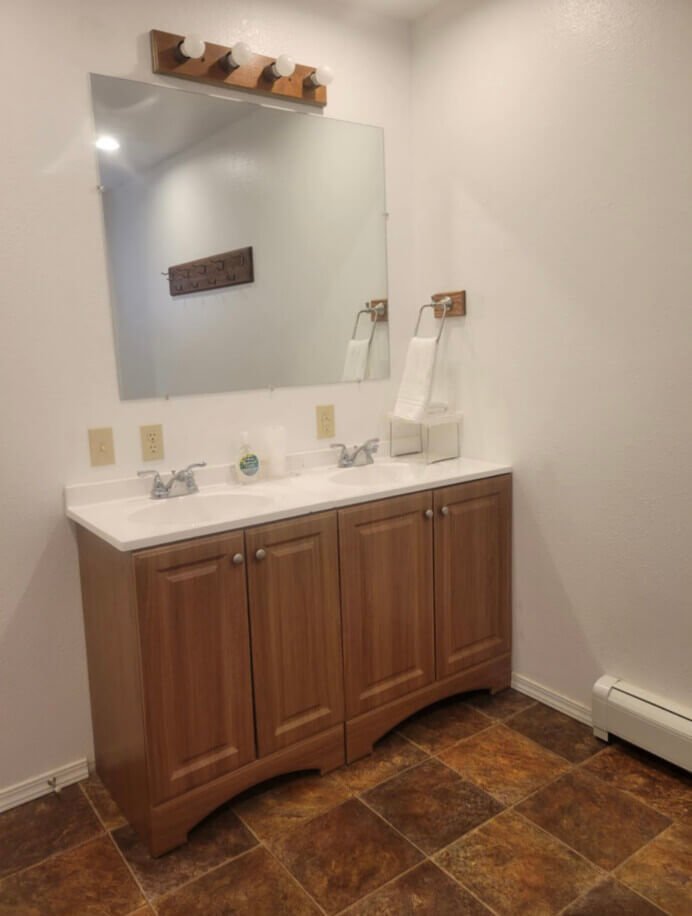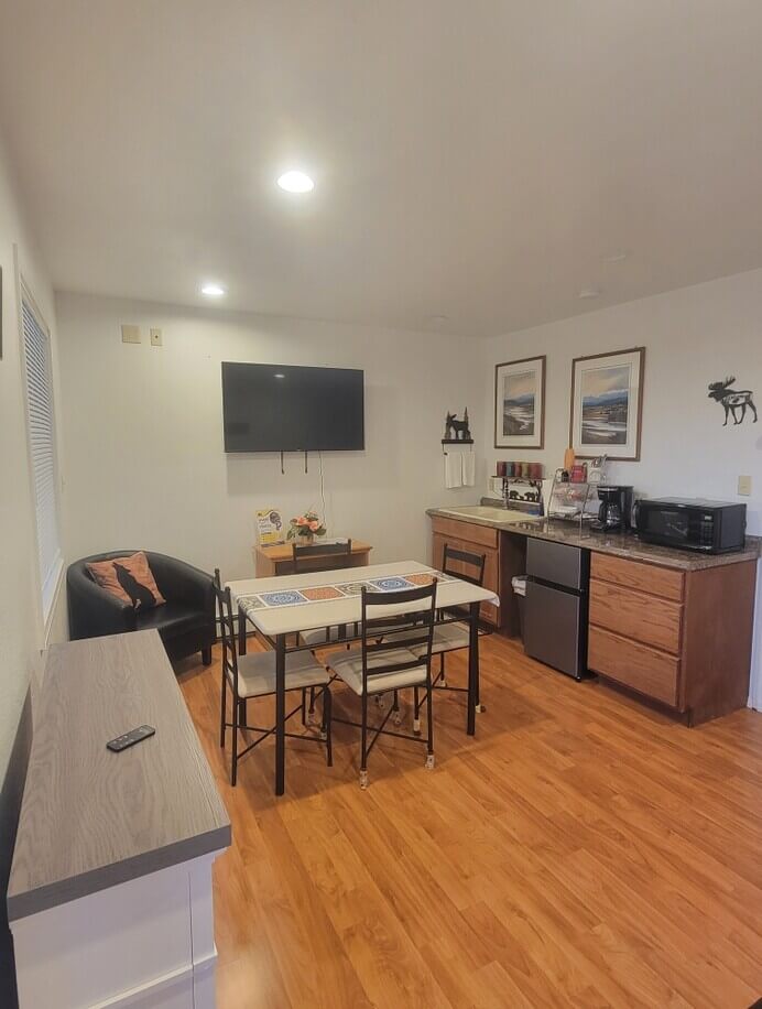 - Small kitchenette with microwave, coffee maker, mini fridge, & dining table downstairs